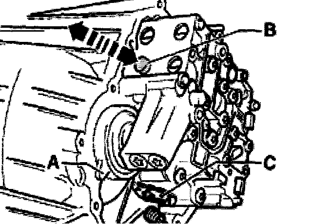 - Detent plate -arrow- moves forward and backward. Roller -B- must engage in individual grooves. Selector lever position slide -C- moves forward and backward in steps.