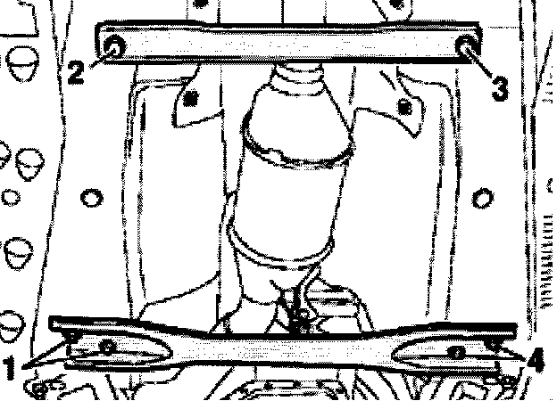 - Remove bolts -1- to -4- on both floor cross members