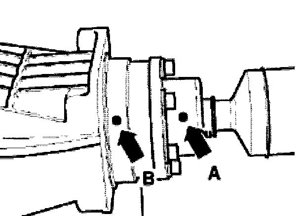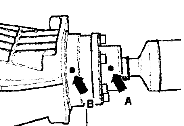 - Check whether there is a factory marking (color marking) on the drive shaft. If not, mark location of driveshaft flange (arrow -A-) to rear final drive (arrow -B-) with color.