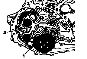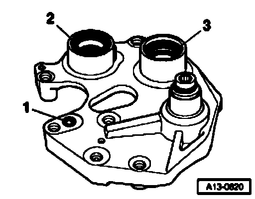 - Use mandrel to drive out sealing rings -2- (for AC compressor drive) and -3- (for power steering pump drive) from front.