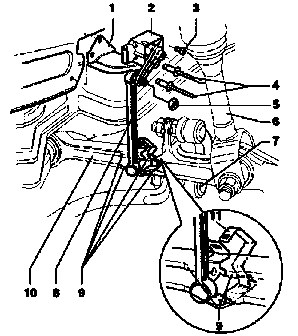 For this, the position of lower left control arm relative to body is transferred to left front level control system sensor -G78- via a coupling rod. This sensor passes on electrical signals to control module for vertical aim control system.