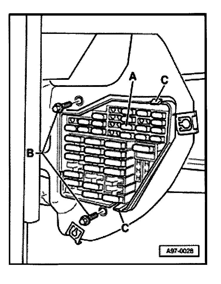 - Remove both mounting bolts -B-, then press locking mechanism -C- while pulling fuse bracket -A- toward rear.