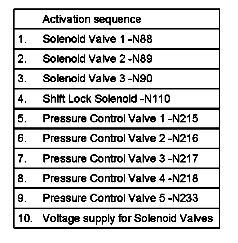 ^ The function of Solenoid Valve I -N88, Solenoid Valve 2 -N89 and Solenoid Valve 3 -N90 and Shift Lock Valve are checked acoustically during output DTM. During the acoustical check avoid noise close by as the shift noise (clicks) in the transmission are very quiet
