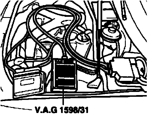 - Connect up test box V.A.G 1598/31 to wiring harness connectors. Engine control module is not to be connected. Connect ground clip of test box to ground (not shown in Fig.).