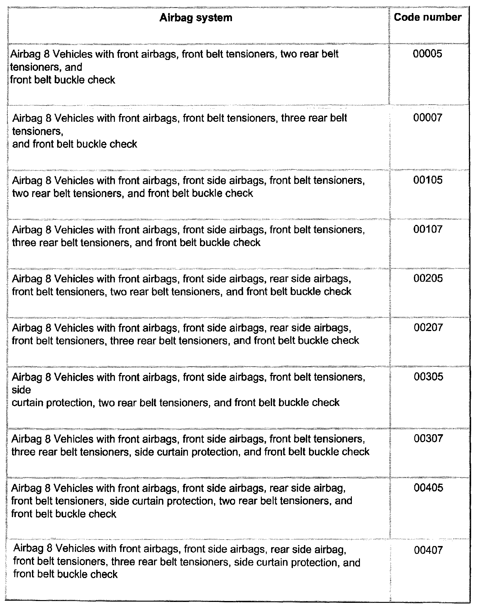 Coding table for airbag control module, vehicles from 23.00 on: