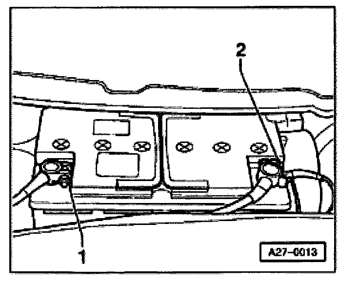 - Disconnect Ground (GND) strap -1- at battery Ground (GND) terminal by loosening hex nut (size = 10 mm).