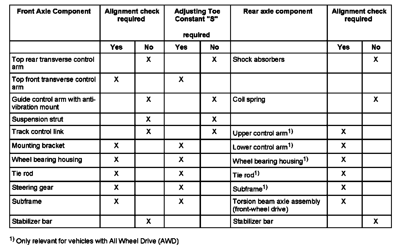 The following table shows the meaning of the Part numbers which are critical for wheel alignment.