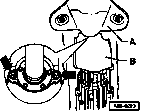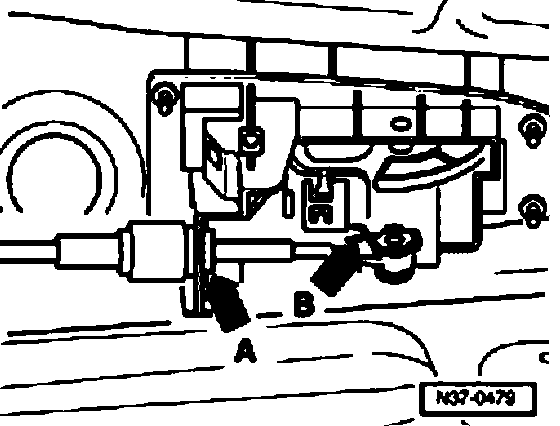^ Pull out lock plate -A- for selector lever cable at mounting bracket downward.