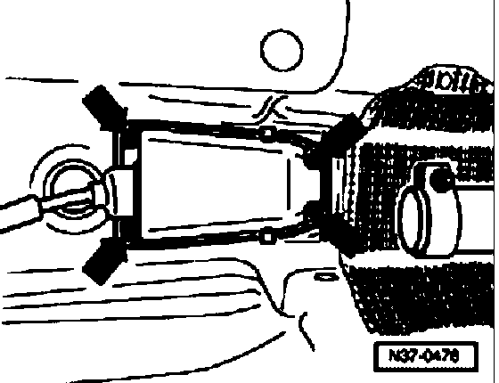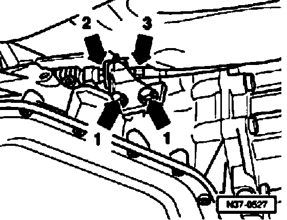 ^ Tighten bracket to transmission -arrows 1- and selector lever cable to bracket -arrow 2- with proper torque. Counter-hold at hex head 3-.