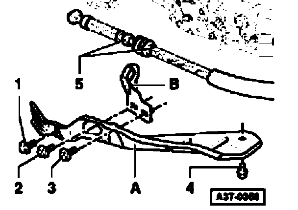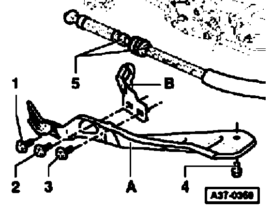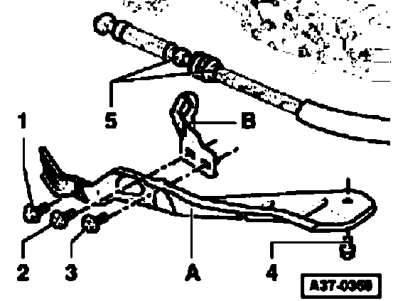 ^ Remove bracket - B- from selector lever cable by removing nuts -5-.