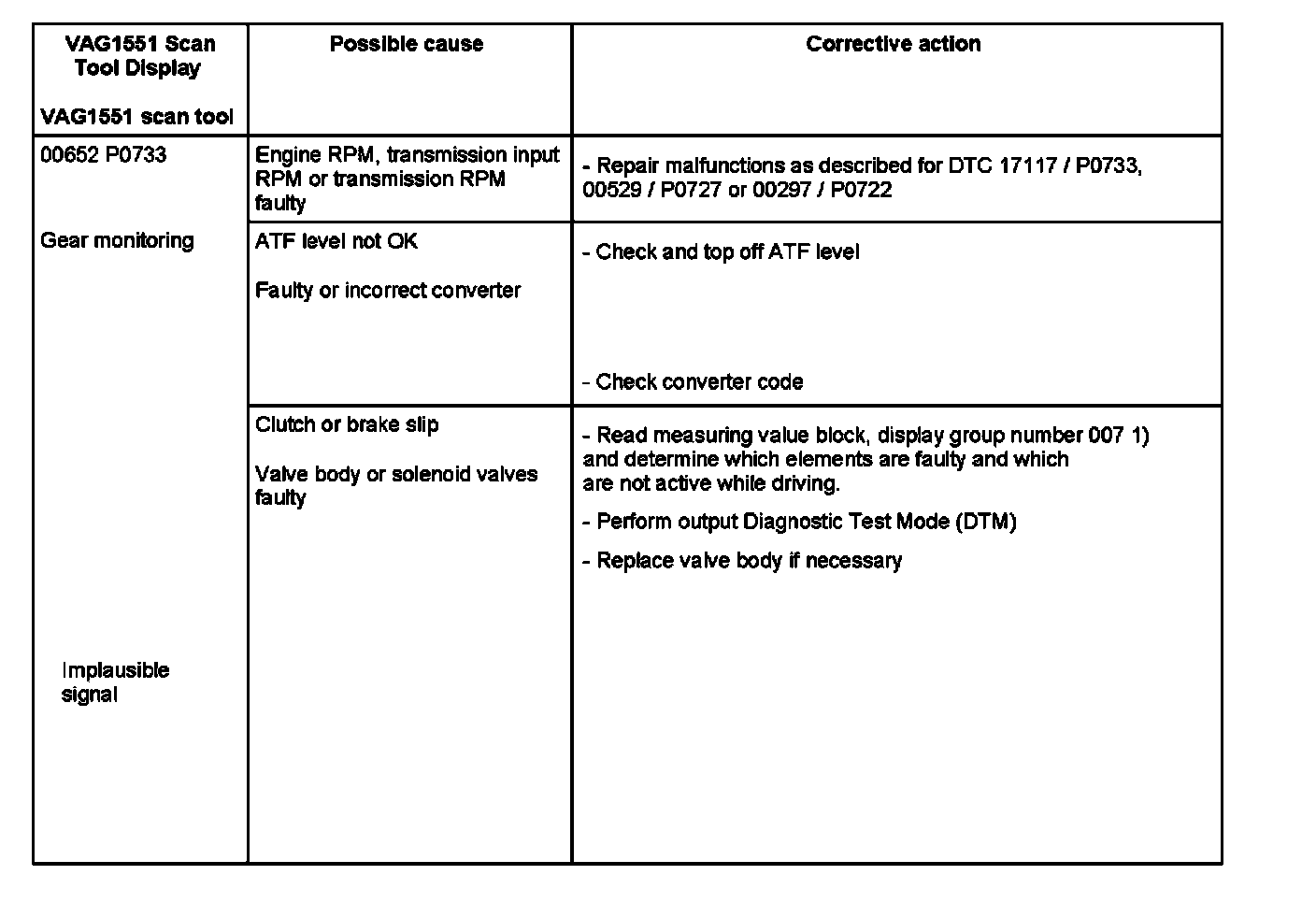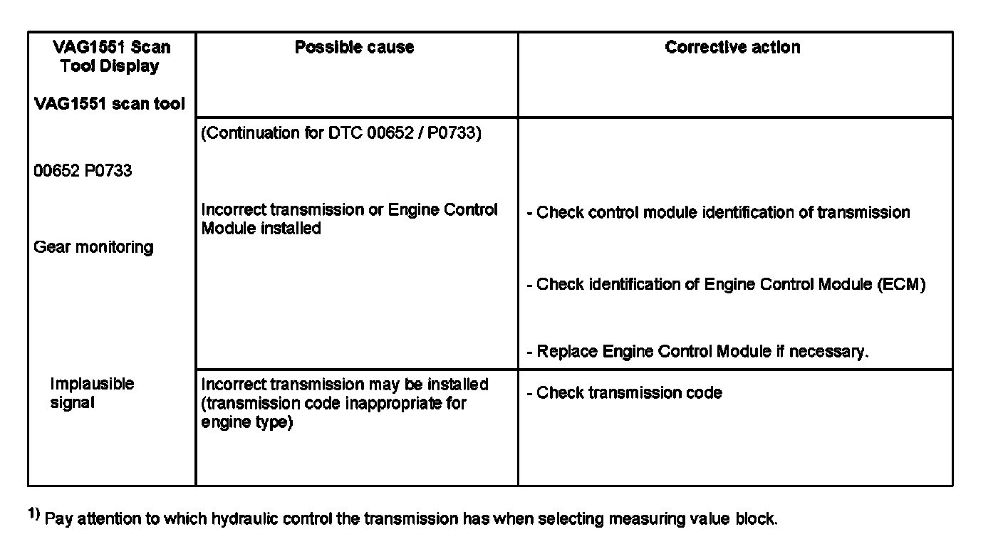 1) Pay attention to which hydraulic control the transmission has when selecting measuring value block. For a more detailed description; Refer to "Read measuring value block". Note: For malfunction recognition for DTC 00652 / P0733:
