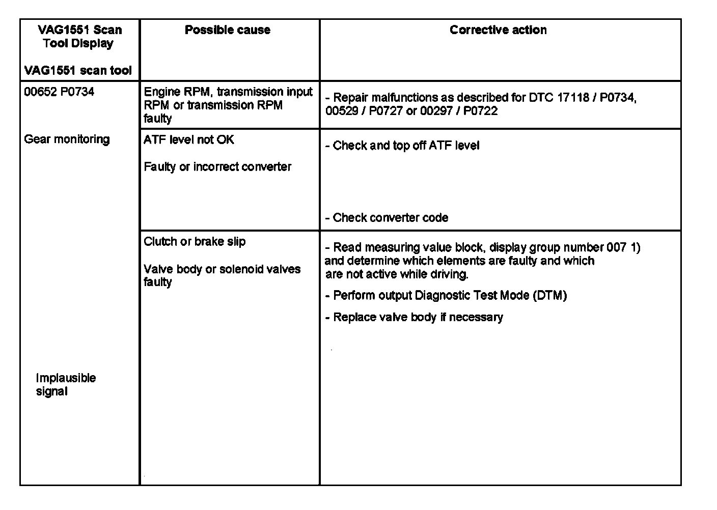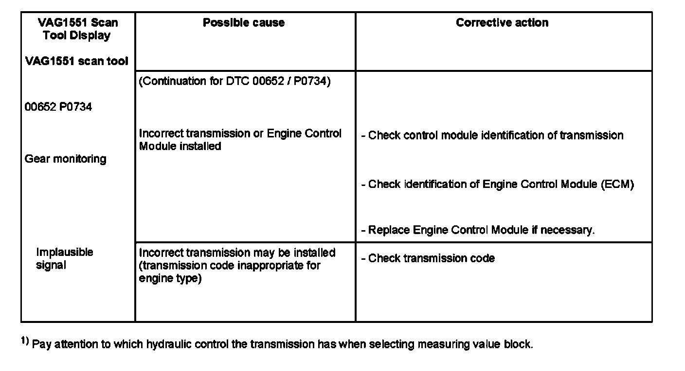1) Pay attention to which hydraulic control the transmission has when selecting measuring value block. For a more detailed description; Refer to "Read measuring value block". Note: For malfunction recognition for DTC 00652 / P0734: