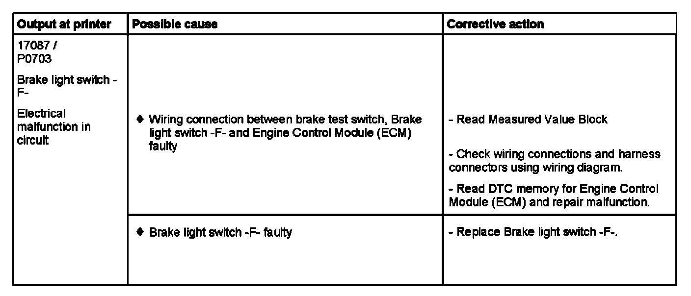 ^ Conditions for DTC recognition: The signals from the brake light switch and the brake test switch are transmitted over the CAN bus circuit to the Transmission Control Module (TCM) and evaluated there. After 10 consecutive occurrences of an implausibility between the brake light switch and the brake test switch (one switch actuated, the other not) this DTC is saved in the Transmission Control Module (TCM).