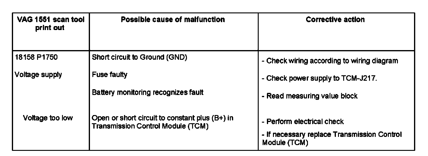 ^ In case of power loss at terminal 30, the application values are lost, meaning that the Transmission Control Module (TCM) must relearn these values at a new start-up. During this new "re-learning" the shift quality can be not as good as normal