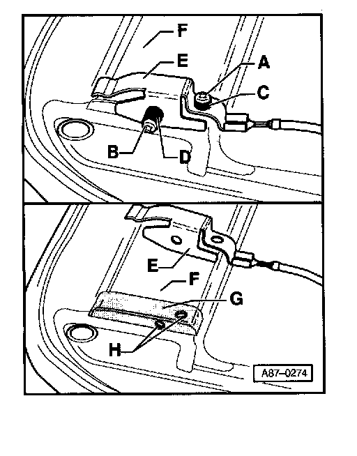 - If there is a short circuit between contract -E- and the sunroof (-F-), a fabric adhesive tape must be placed on the contact surface -G-. The adhesive tape should be pierced carefully at holes -H-.