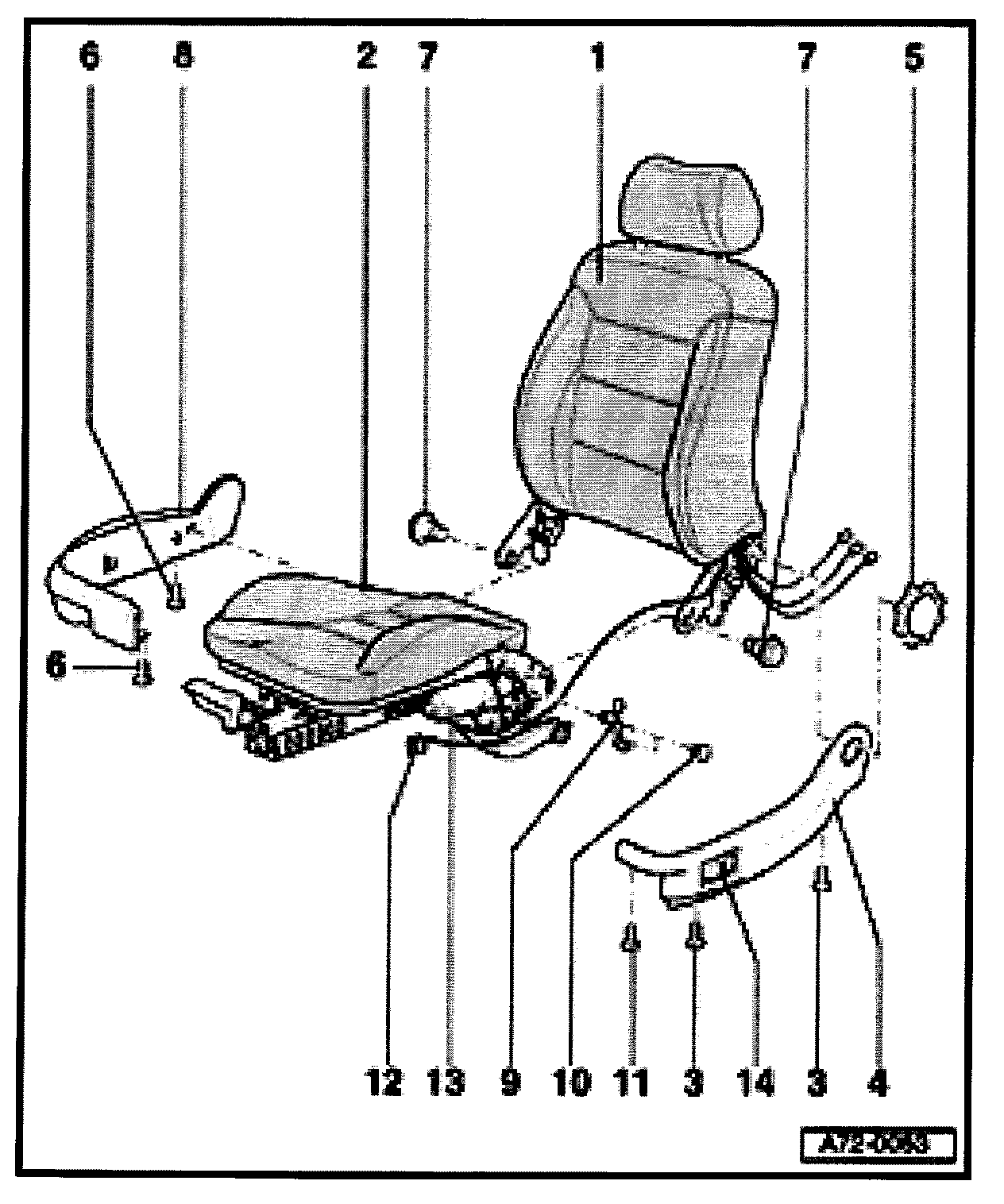 - Remove bolts -7- (4x) from seat pan -2-. A washer is installed on rear bolt on outboard side (side with adjuster knob).