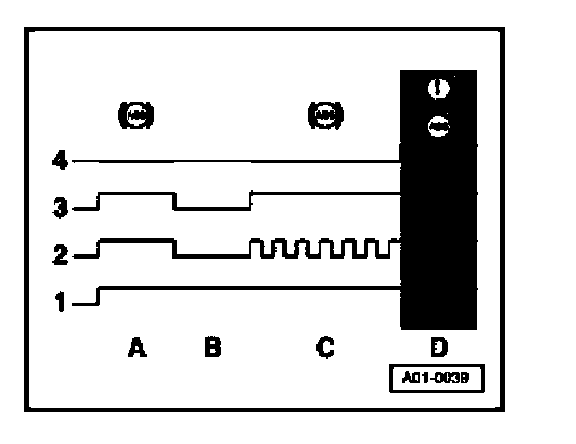 A During phase "A" (after ignition is switched on) the ABS/EDL warning light is activated for two seconds during the self-test by means of signal "2", and comes on. During this phase an internal function in the instrument cluster suppresses the activation of the brake system warning symbol.