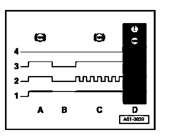A- During phase "A" (after ignition is switched on) the ABS/EDL warning light is activated for two seconds during the self-test by means of signal "2", and comes on. During this phase an internal function in the instrument cluster suppresses the activation of the brake system warning symbol.