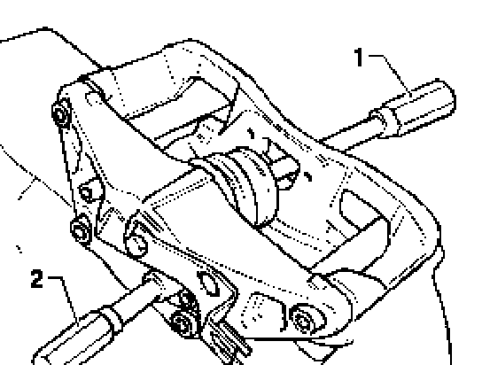 Note: Place a wooden board into the recess of the caliper housing to catch the piston so it is not damaged.
