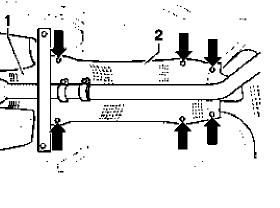 - Remove retaining nuts (arrows) from heat shield -2- and slide heat shield forward.