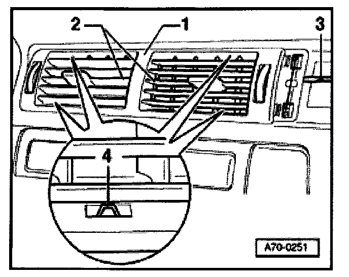 The instrument panel vent -1- is fastened via clips -4- in the instrument panel.