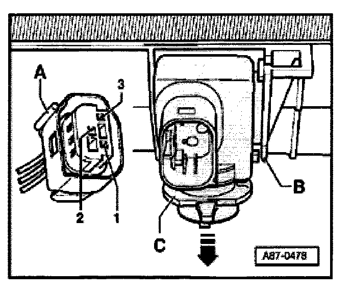 - Disengage locking mechanism -B- and push sensor -C- down.