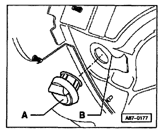 - Drainage duct -A- is bolted to the floor panel with bolts -B- and must not interfere with the operation of the evaporator housing drain valve.