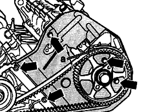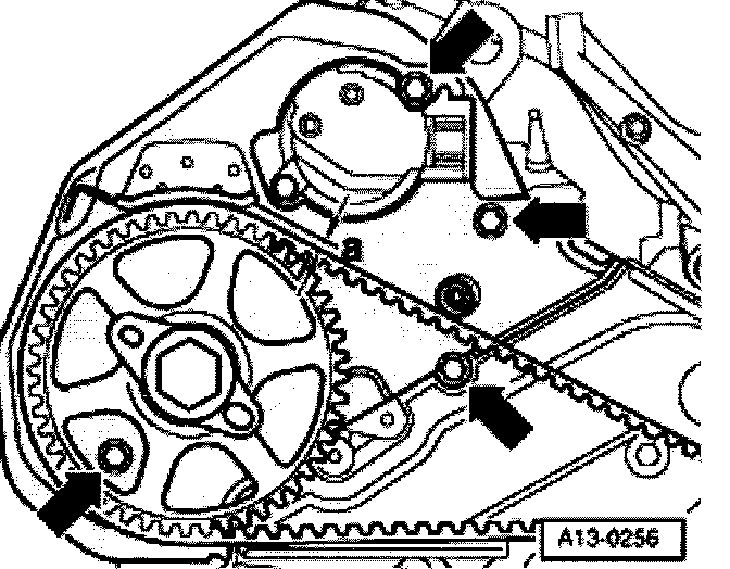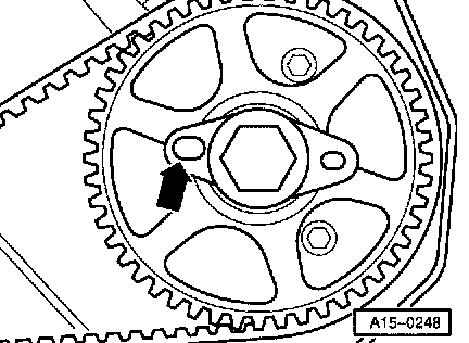 - Check position of camshafts: larger holes -arrow- in securing plates on camshaft sprockets must be in line with each other and facing inward. If not, turn crankshaft one revolution.