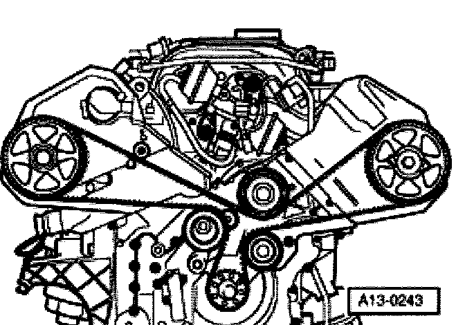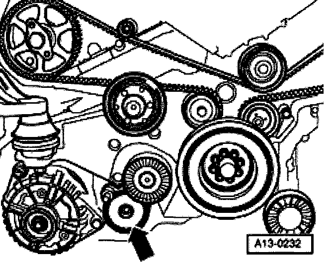 - First install toothed belt on crankshaft sprocket, idler wheel for tensioner, tensioning roller, camshaft sprocket for cylinder bank 5-8, coolant pump and damper wheel.