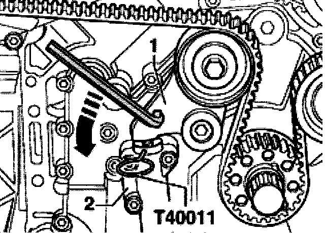 - Using 8 mm Allen key, turn toothed belt tensioning lever-1- in direction of arrow until tensioning element -2- is compressed far enough to insert pin T40011 in the drilling and in plunger.