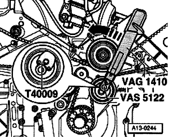 - Tension toothed belt initially to 4 Nm (35 inch lbs.) using tensioning key T40009 and torque wrench VAG 1410 with socket attachment VAS5122 by turning in direction of arrow. Then tighten eccentric wheel to 22 Nm (16 ft. lbs.).