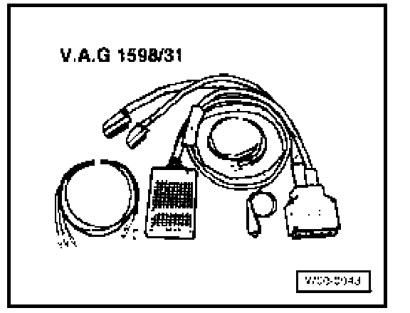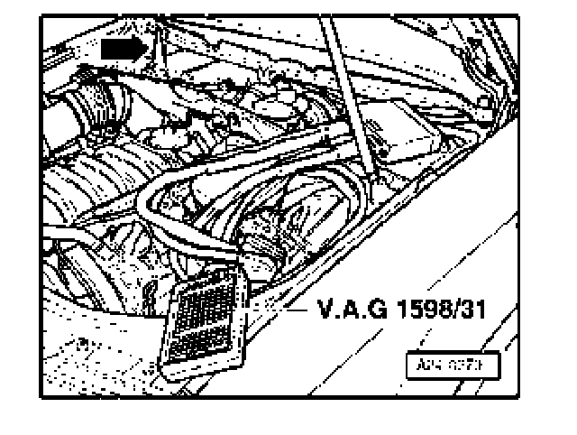 - Connect e.g. VAG1598/31 test box to connectors of wiring harness. Clamp test box Ground (GND) clip to Ground (GND) (arrow). Relevant test procedures note whether Engine Control Module (ECM) should also be connected to the test box.
