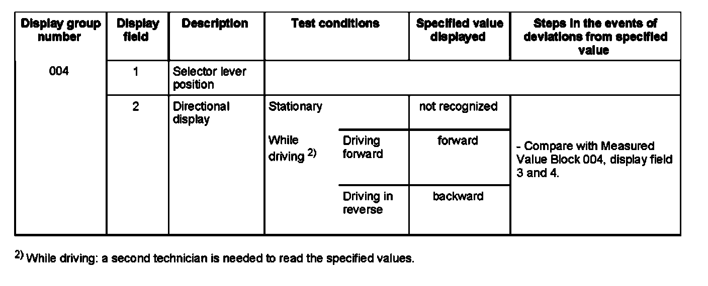 ^ If "0 RPM" is shown in display field 3 or 4, the corresponding sender is faulty and the Transmission Control Module (TCM) must be replaced.