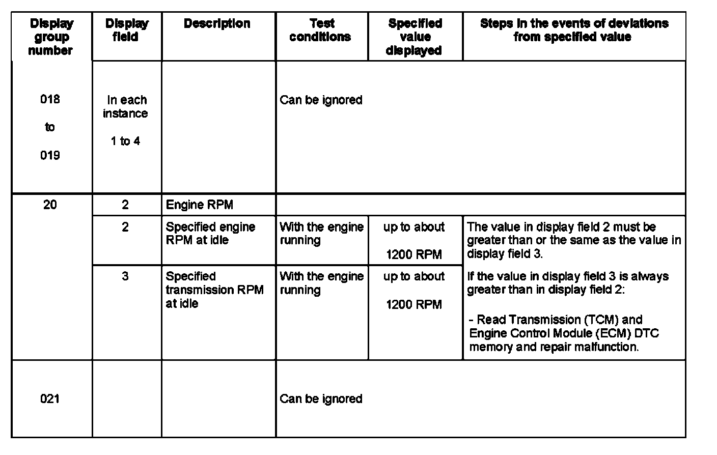 Display Group Number 018 To 19, Display Fields (1 - 4) / Display Group Number 020, Display Fields (2 - 3) / Display Group Number 021, (Can Be Ignored):