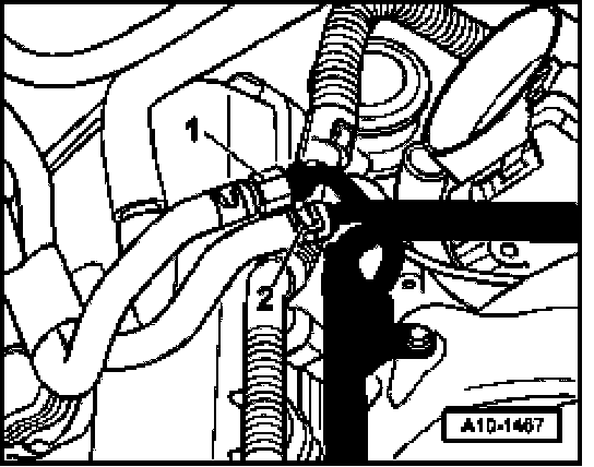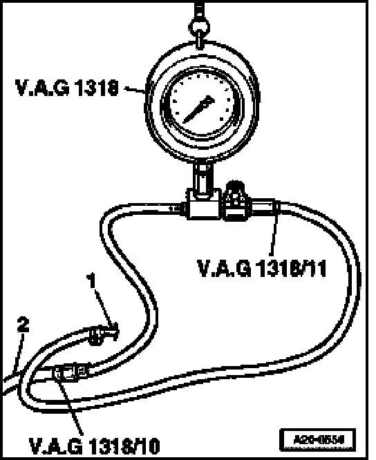 - Attach V.A.G 1318 with adapters V.A.G 1318/10 and 1318/11 and an auxiliary hose between fuel distribution pipe -1- and return hose -2-.