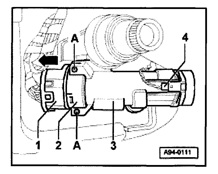 - Loosen mounting bolts -A- somewhat and pull ignition/starter switch -2- out of steering lock housing -3- in direction of arrow.