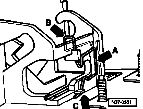 ^ Insert spring from above -arrow B- and attach to attachment hook -arrow C-.