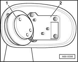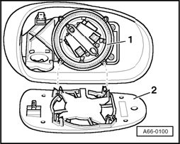- Press mirror glass - 2 - out of mirror adjuster unit - 1 - using special tool 80-200, starting at bottom and then top.