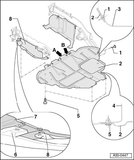 - When installing, insert lugs on front section of noise insulation above (arrow - A -) and below (arrow - B -) lock carrier.