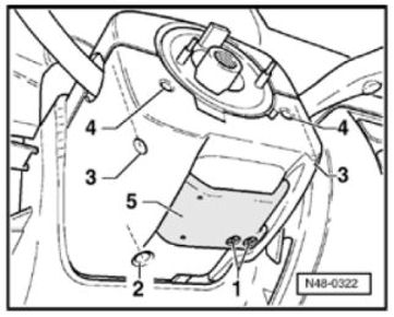 - Remove bolts -1- and detach handle for steering column adjustment -5-.