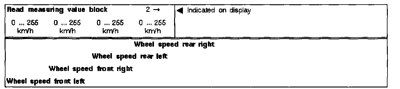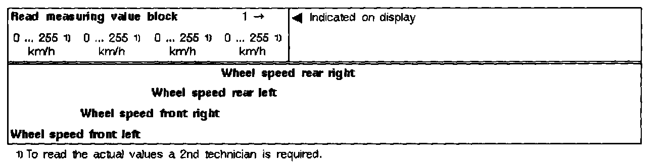 The instantaneous wheel speeds are indicated. They serve to check the wheel speed sensor signal (wheel must be raised and turned by hand).