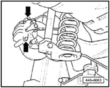 - Unscrew brake caliper housing -arrows- and hang to one side, securing it in position on vehicle with wire.