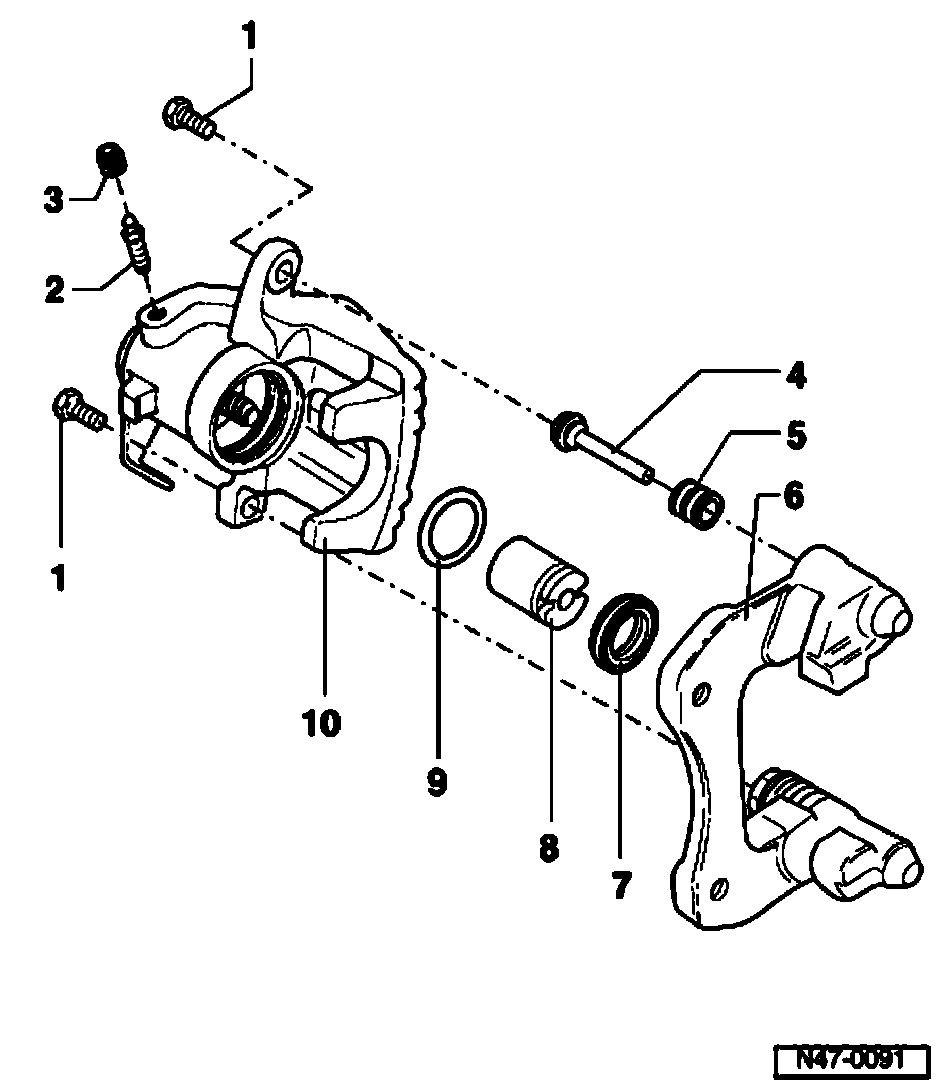 ^ If a leak exists at the parking brake cable lever replace brake caliper housing