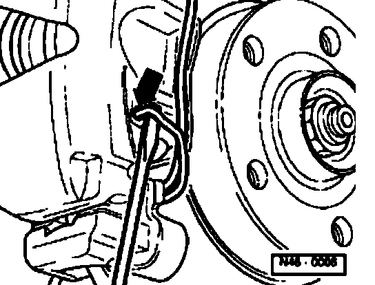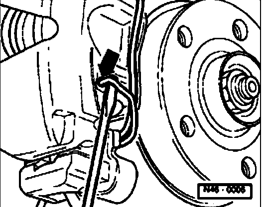 ^ Detach brake caliper housing and secure on vehicle with wire.