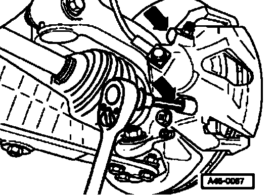 ^ Pry off brake pad retaining spring from brake caliper housing using a screwdriver (arrow) and detach.