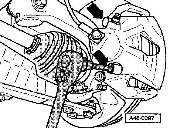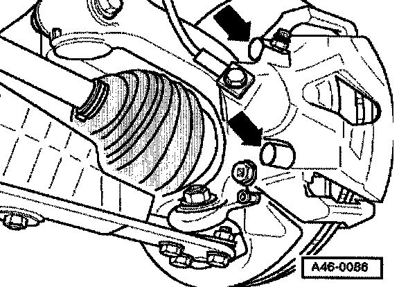 ^ Remove both guide pins - arrows - from brake caliper.