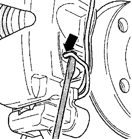 ^ Take off brake caliper housing and secure with wire so that the weight of the brake caliper does not stress or damage the brake hose.