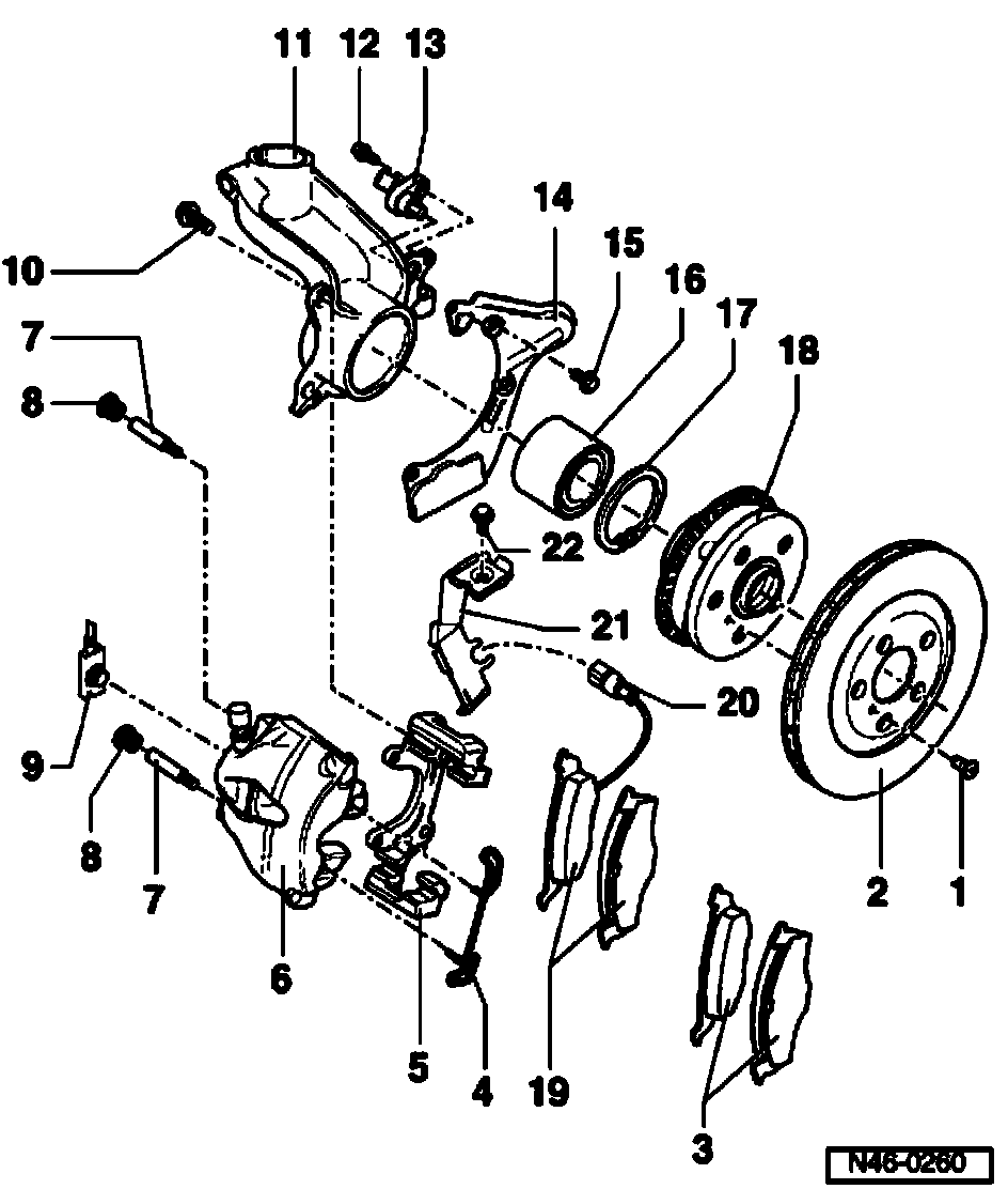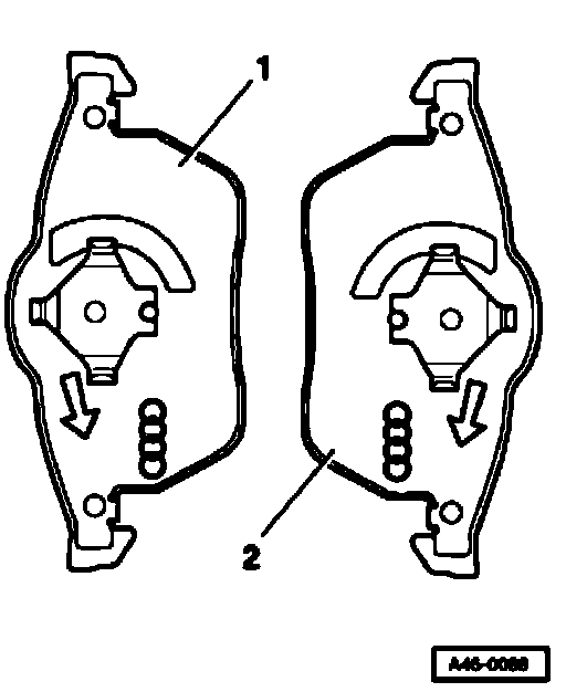 ^ Prior to removing a brake caliper or disconnecting a brake hose from the brake caliper, use brake pedal depressor VAG 1869/2 to prevent the brake fluid reservoir from running dry.