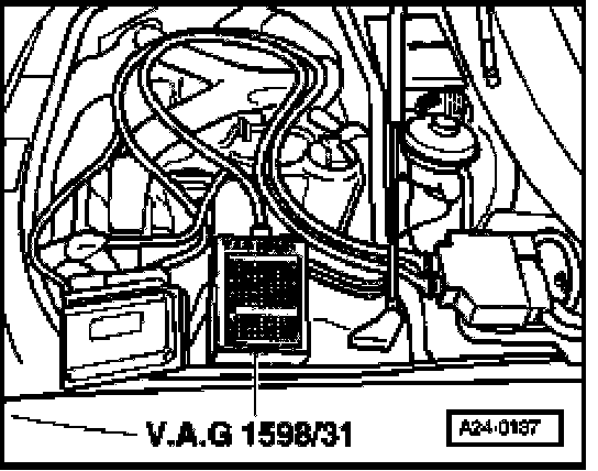 - Connect test box VAG 1598/31 to wiring harness connector. Also connect the Ground clamp on the test box (not shown in the illustration) to the battery negative terminal. The instructions for performing the individual tests indicate whether or not the engine control module itself also needs to be connected to the test box.