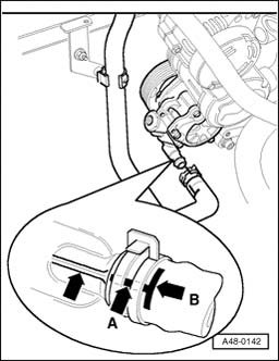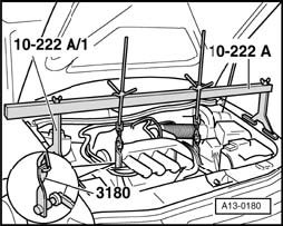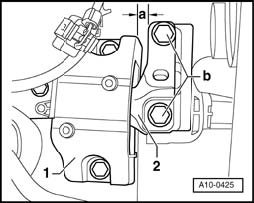 - Distance -a- between engine console -1- and support arm -2- of right-hand engine mount should be about 13 mm. It should be possible to insert a 12 mm flat iron bar without difficulty (e.g. special tool 2011).